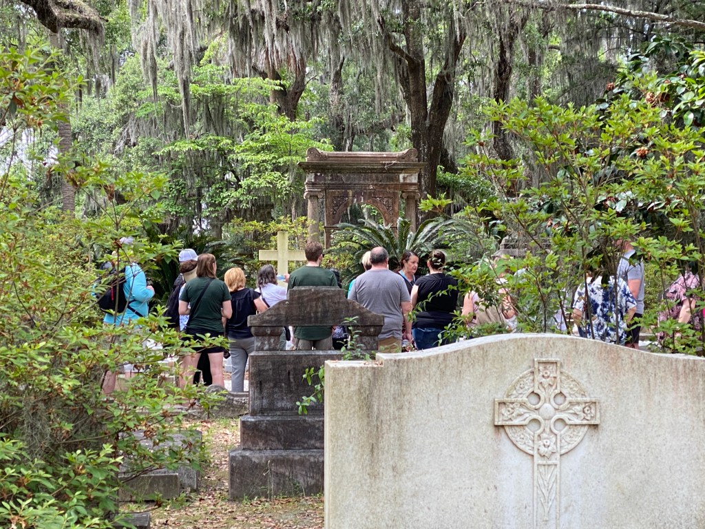 Today Pete, Katie, and I pedaled along the Wilmington River bluff in company with thirty thousand ghosts and a few tourists – groups on foot with guides, and others riding in golf carts with presumably higher-priced guides. Because we had Katie, I missed photographing Johnny Mercer’s grave, though I like the photo I could get, which is of a tour group listening to ghost stories.