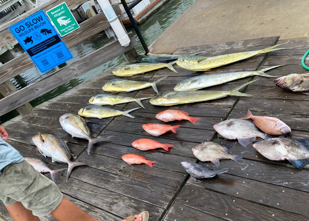 The charter and guides were busy laying out the fish to admire before cleaning and filleting them. I believe this is a snapper-grouper and Mahi mix, but don’t quote me.