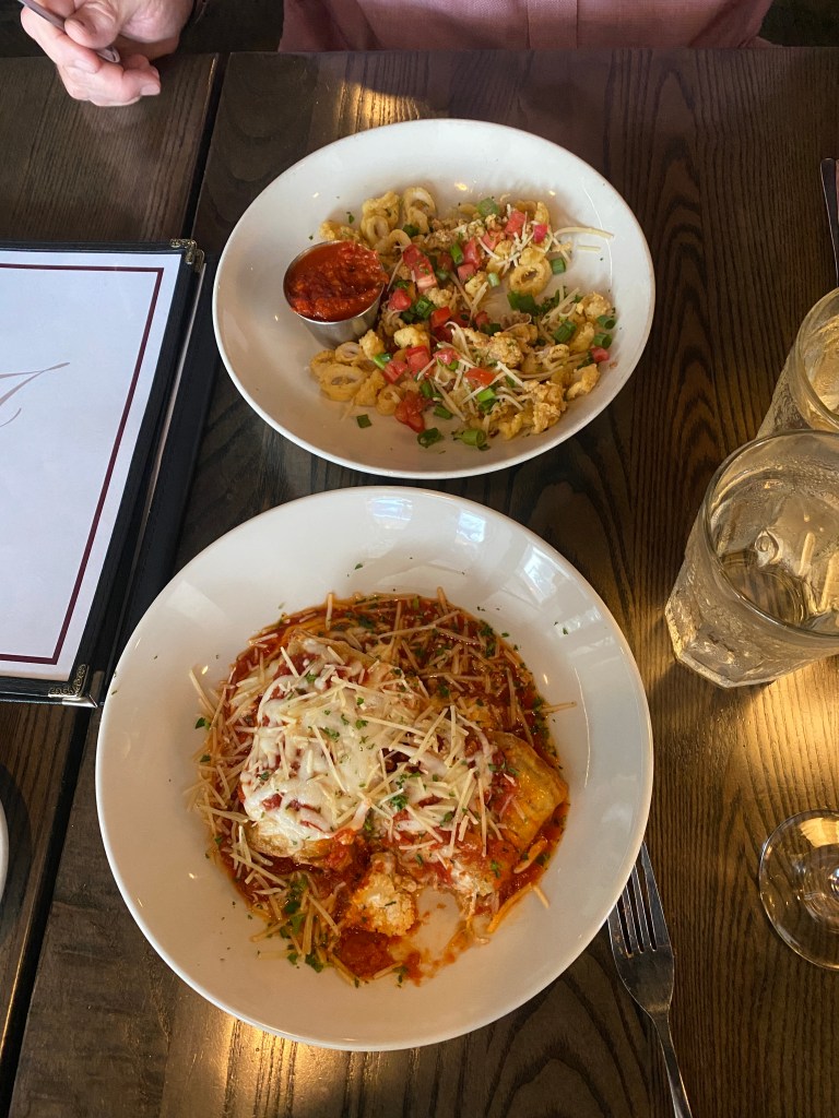 Last night we ate the rare meal out at Joseph’s Italian Bistro, steps from our dock. Everyone says it’s a must-experience. In this case, everyone was right. Even I knew the food was exceptional. Tender, lightly breaded calamari. Eggplant rollatini stuffed with ricotta, mozzarella, Parmesan, and herbs.