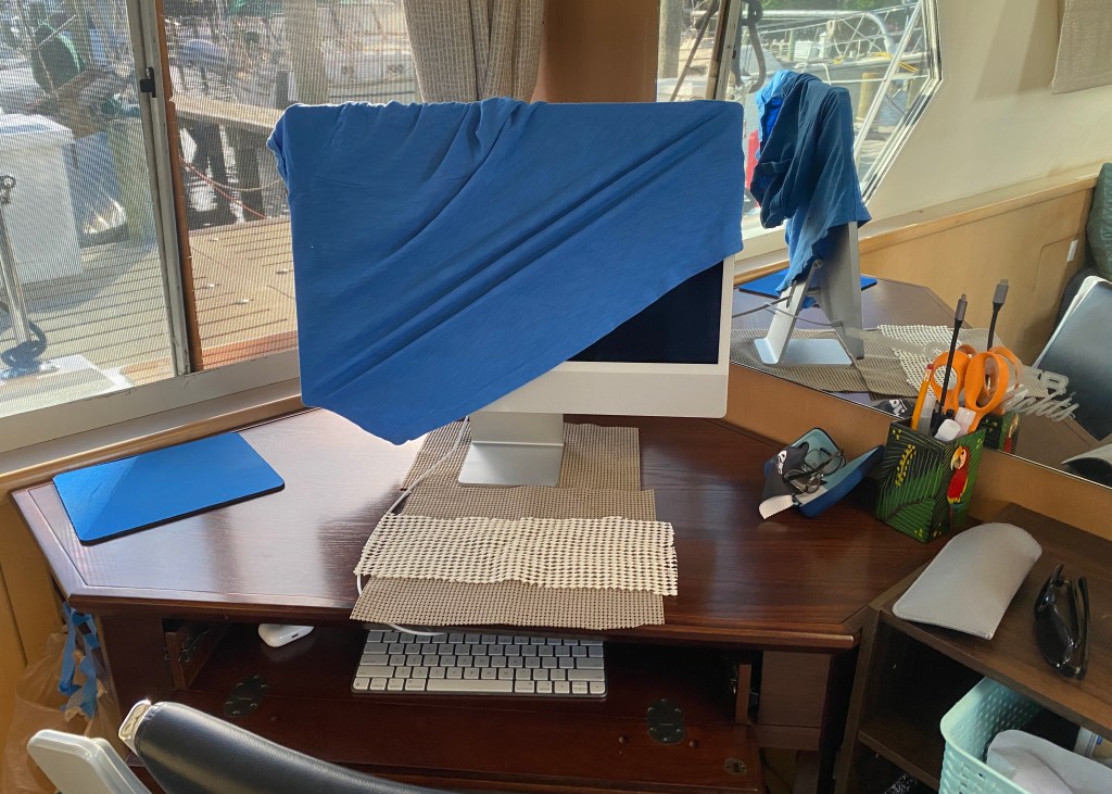 A last thing to do is make a quick round to make sure gear is secured. Two particularly important objects need extra TLC: the countertop TV and my desktop computer. The TV clips to a nearby bulkhead. My computer wears a tee shirt to protect glass before I lay it face down on grip shelf liner.